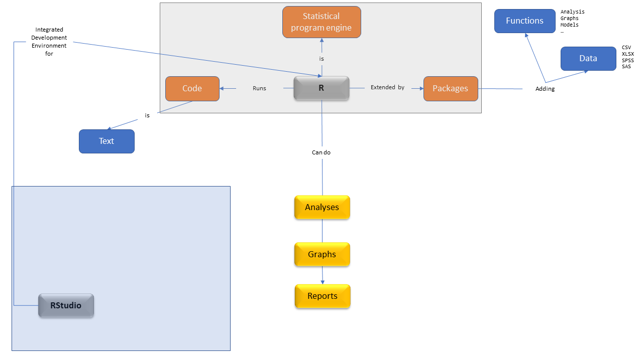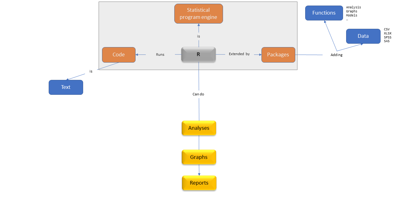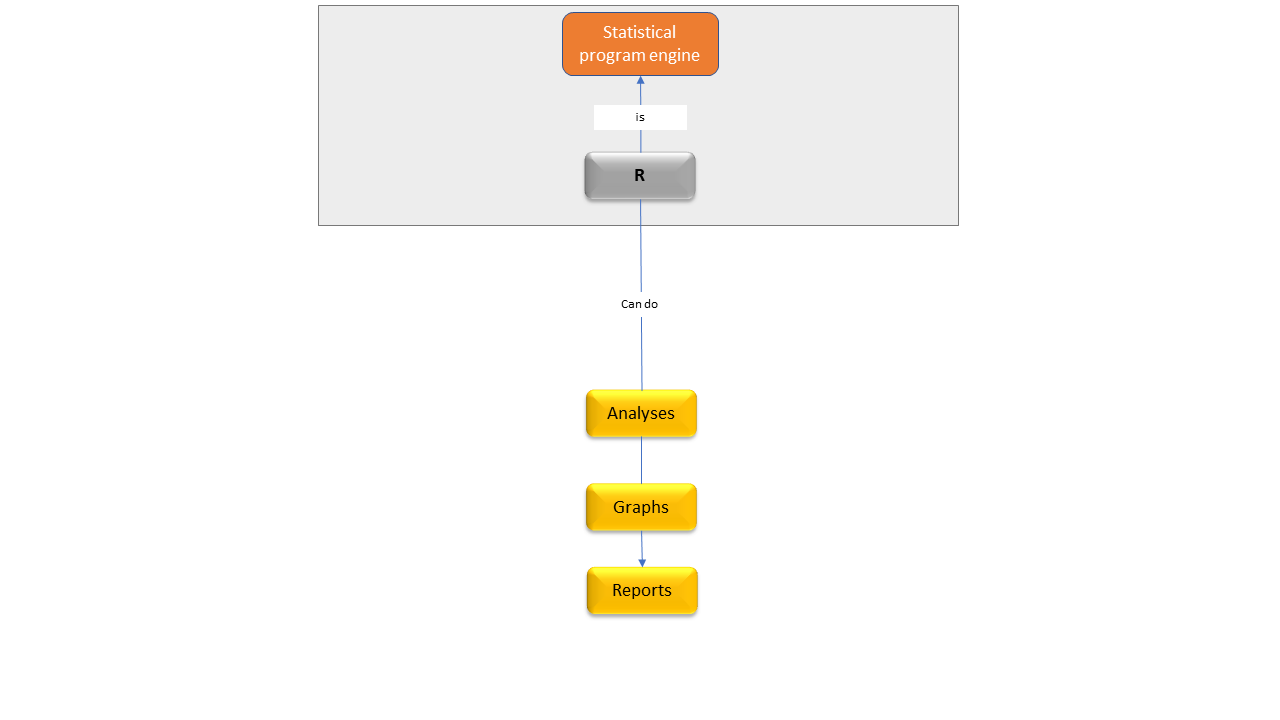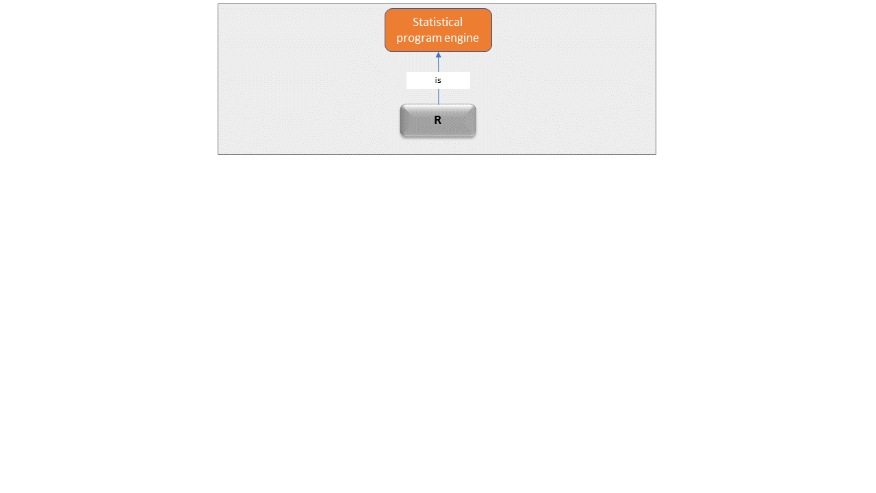 A language: we write R code in the R language.