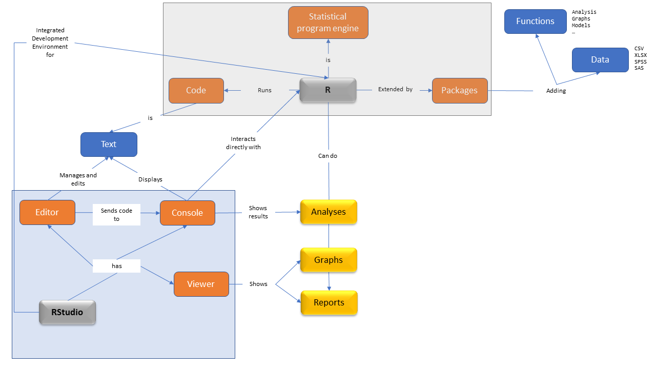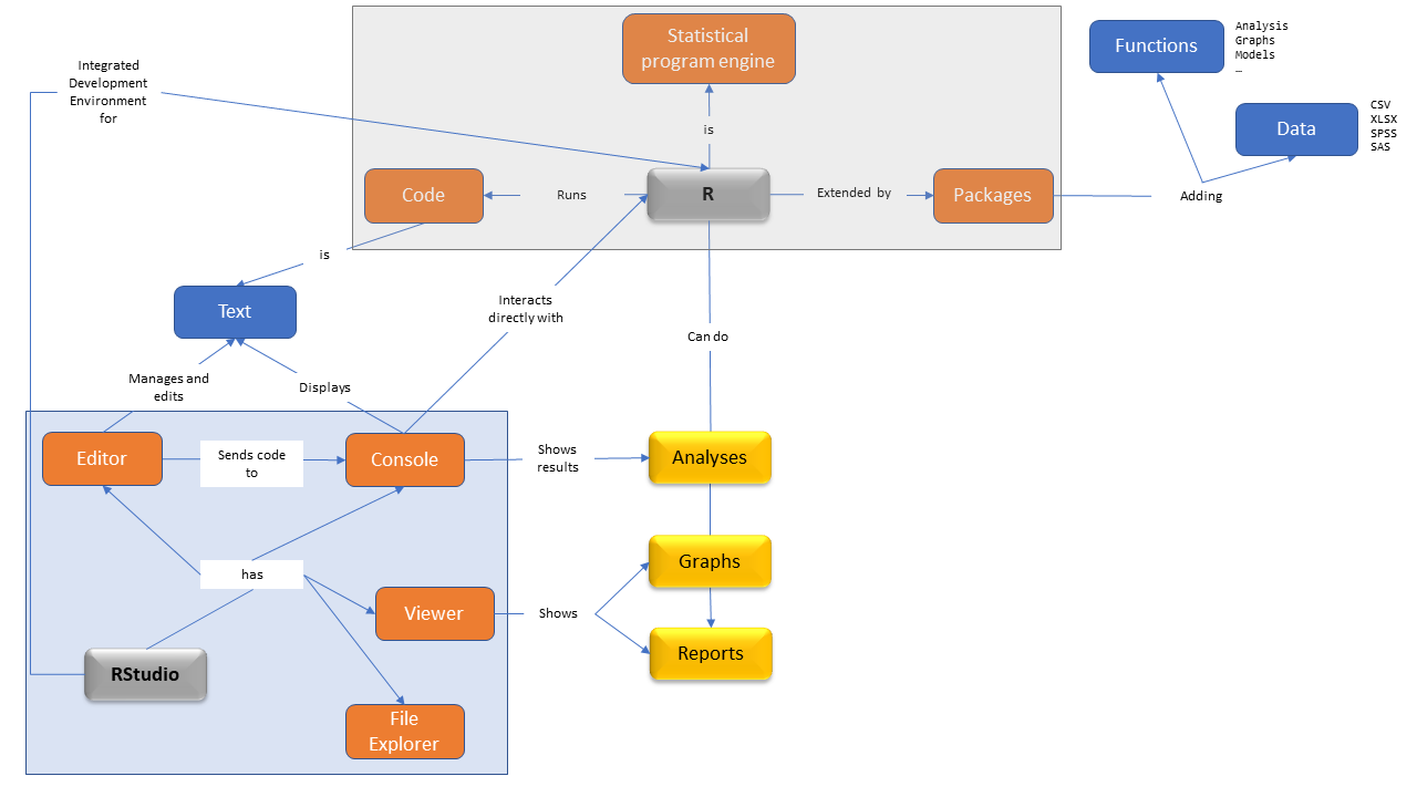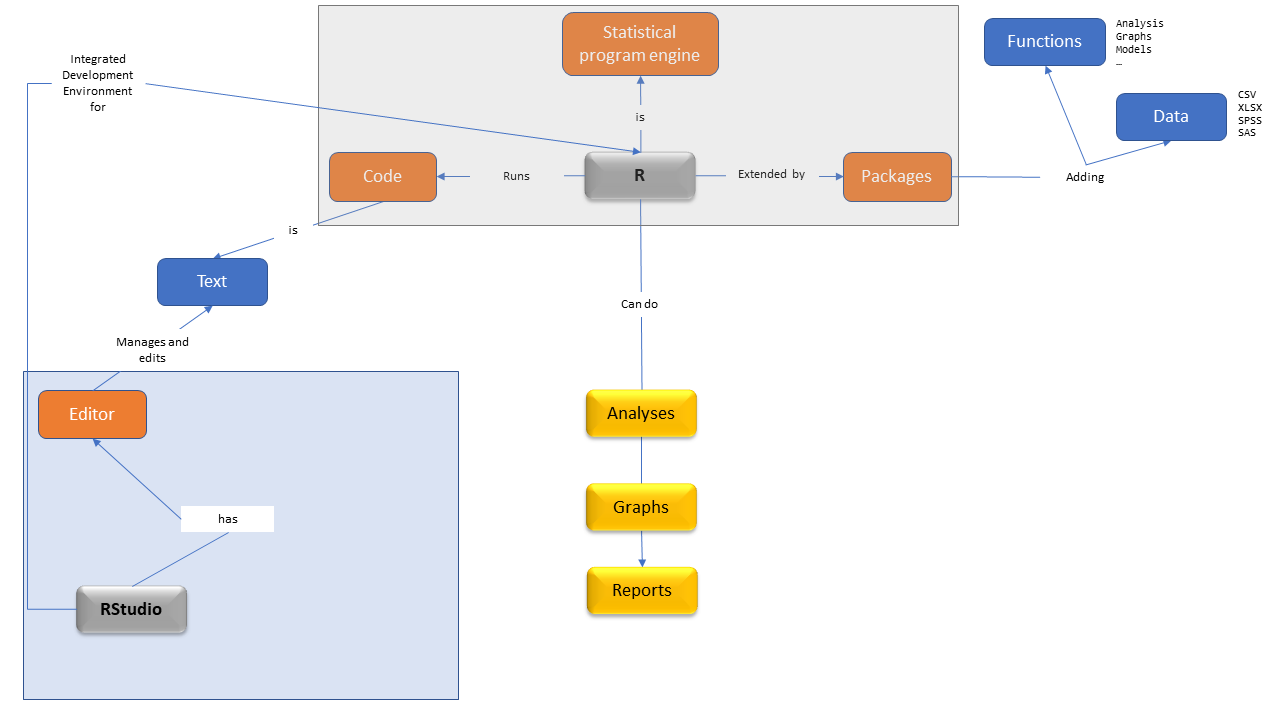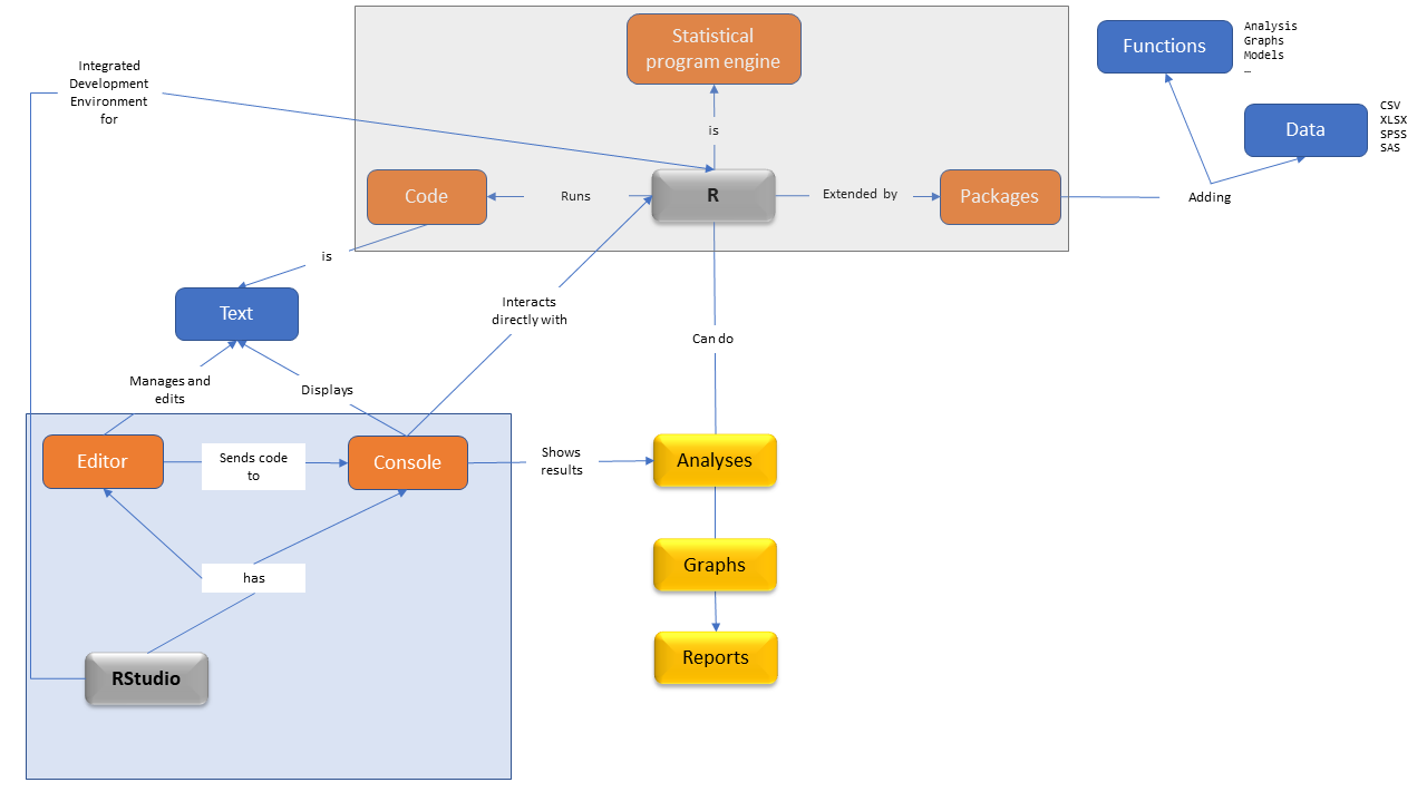 A language: we write R code in the R language.